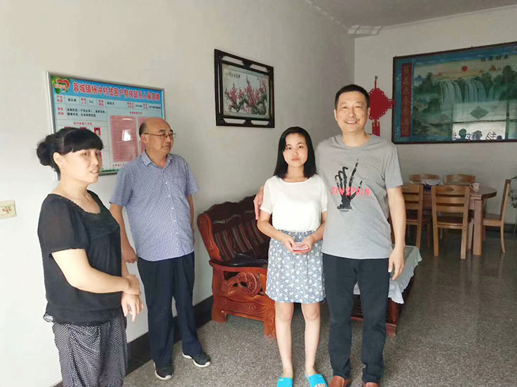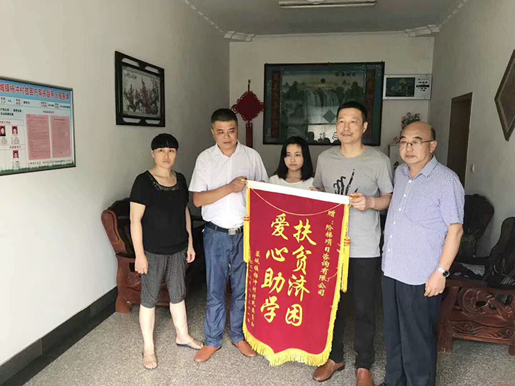 2018年8月31日,階梯項目咨詢有限公司副總裁鄭紅兵一行,來到青陽縣蓉城鎮(zhèn)楊沖村,為該村考上大學(xué)的吳霜同學(xué)送去助學(xué)金。